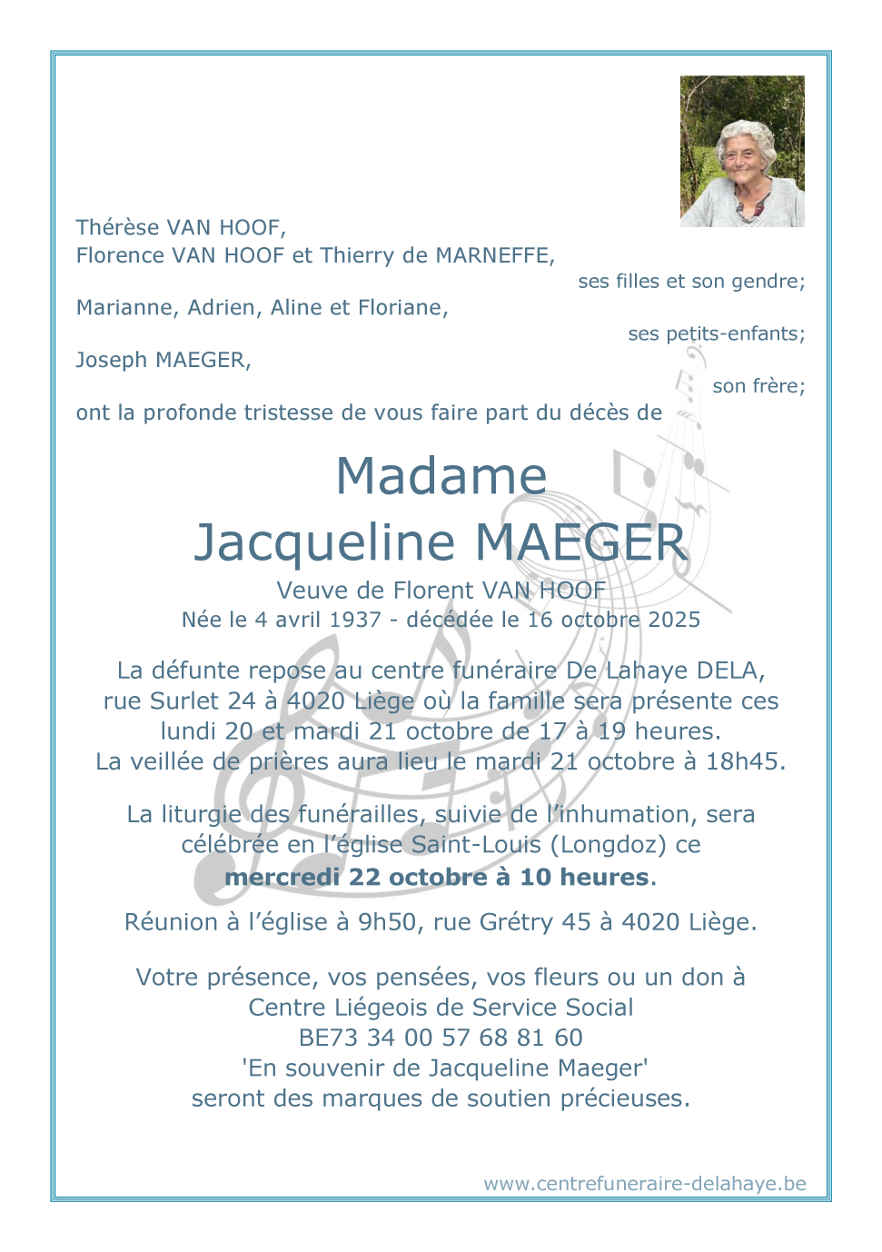 Décédée à Liège (4020) le jeudi 16 octobre 2025 à l'âge de 88 ans
