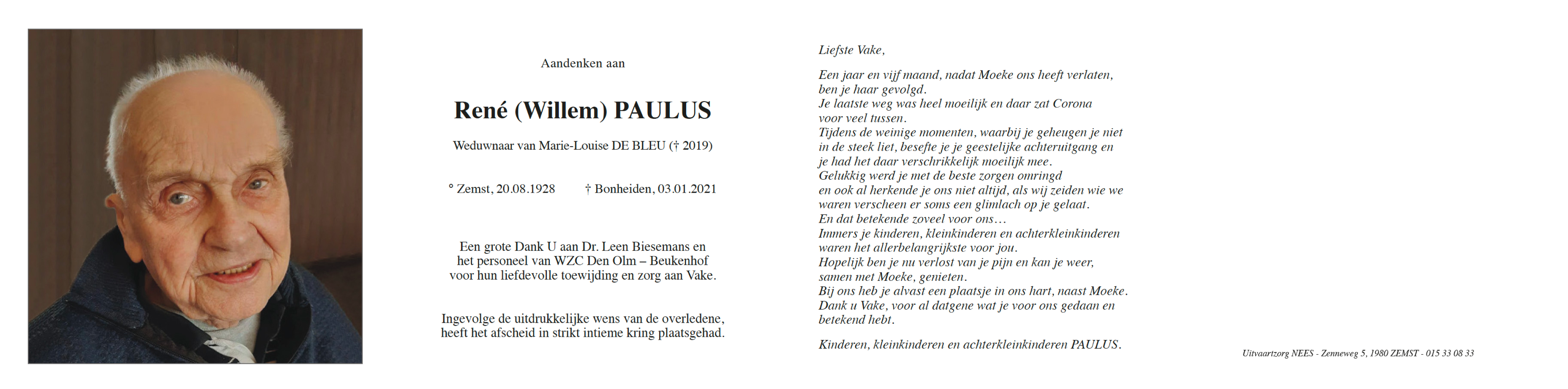 Fallecido en Bonheiden (2820) el domingo, 3 de enero de 2021 a la edad de 92 años