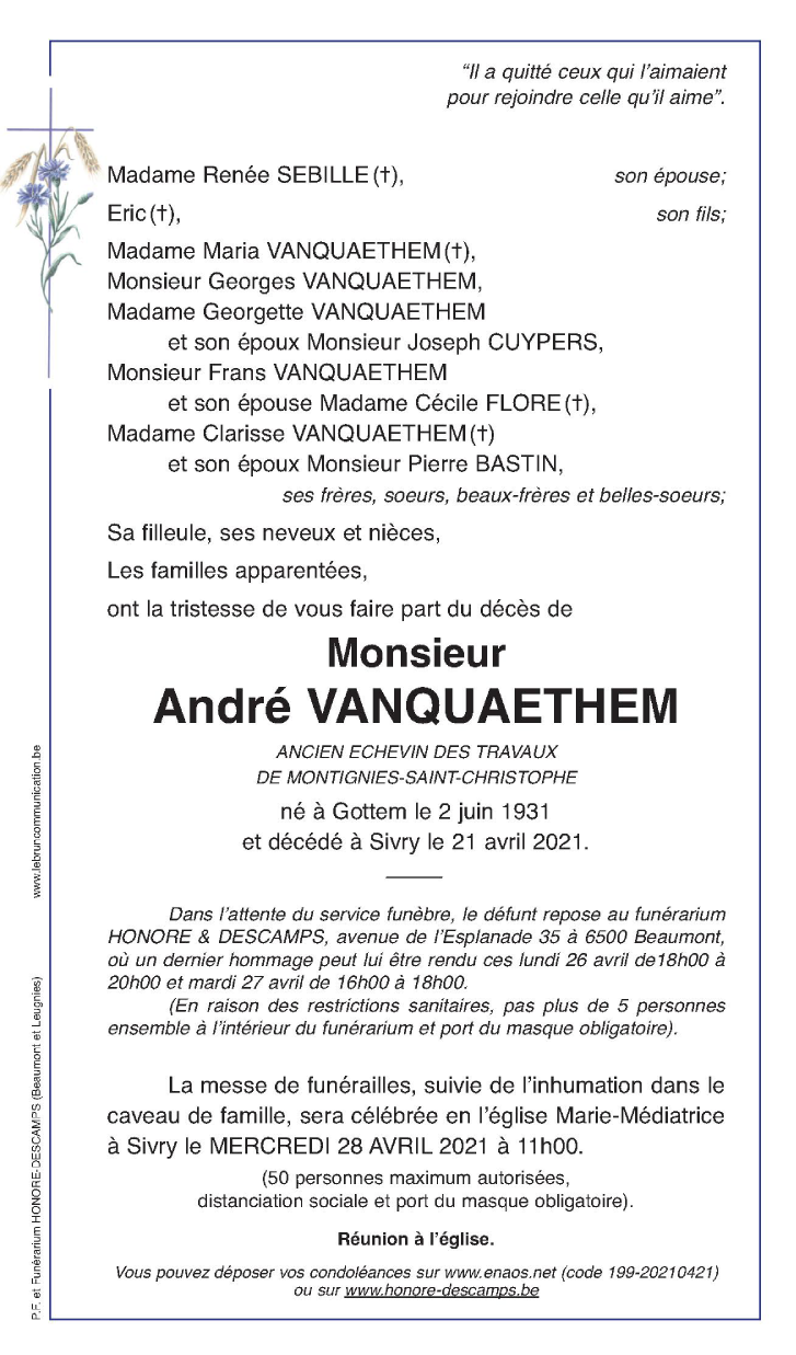 Décédé à Sivry (6470) le mercredi 21 avril 2021 à l'âge de 89 ans