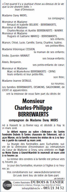 Fallecido en Huy (4500) el miércoles, 21 de marzo de 2018 a la edad de 65 años