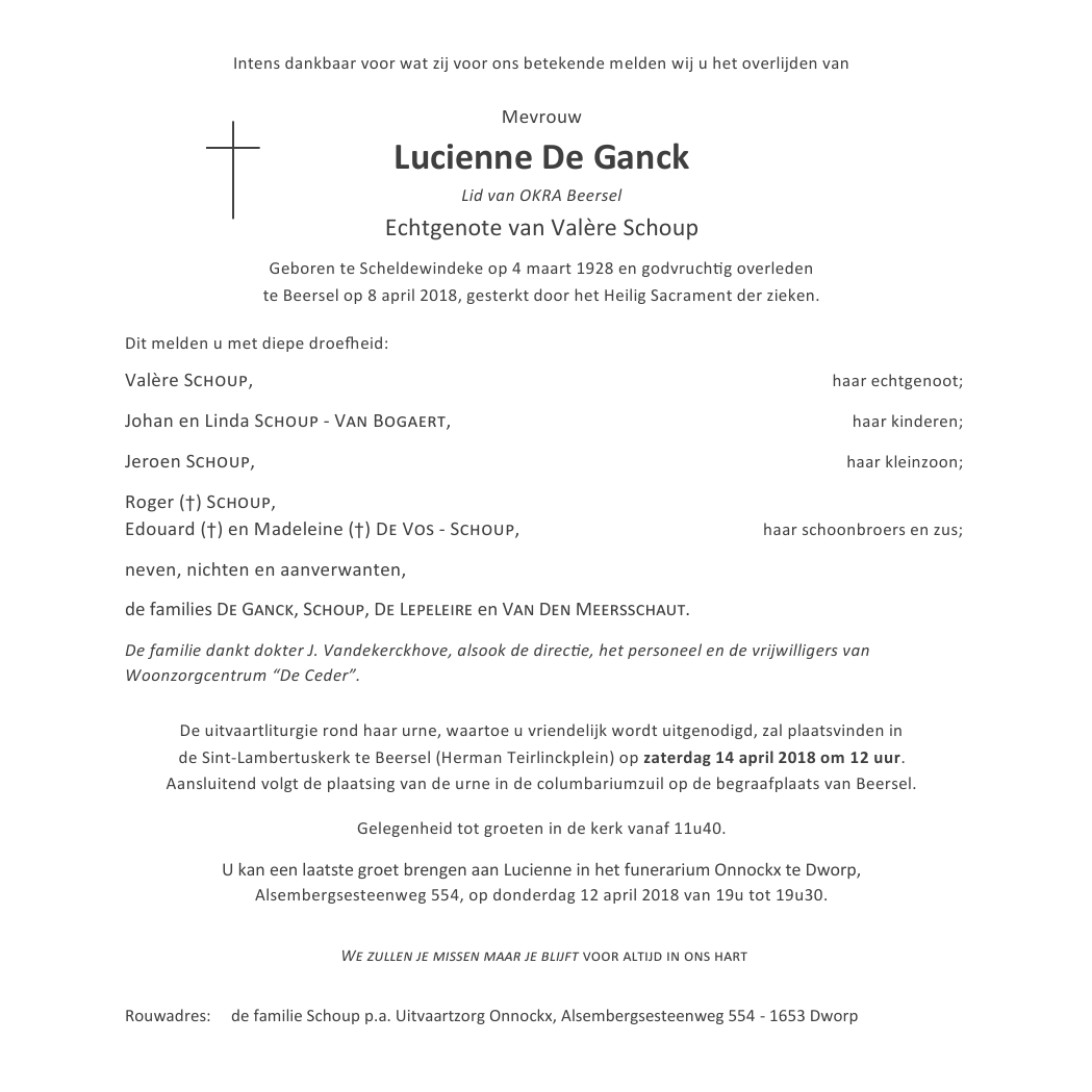 Died in Beersel (1650) on 08 April 2018 at the age of 90 years