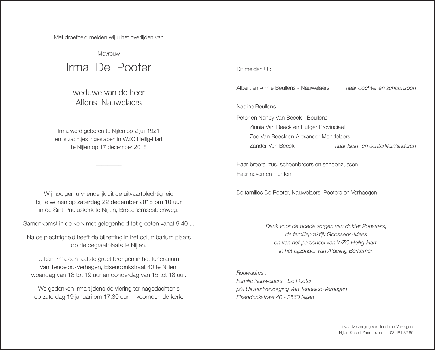 Décédée à Nijlen (2560) le lundi 17 décembre 2018 à l'âge de 97 ans