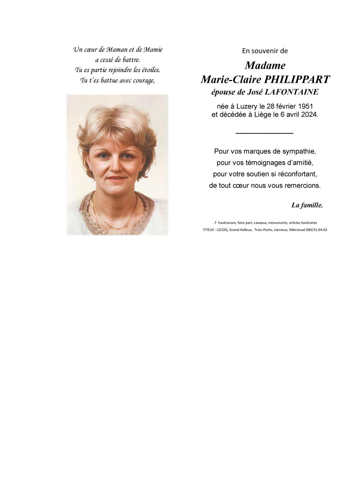 Epouse de Monsieur José LAFONTAINE