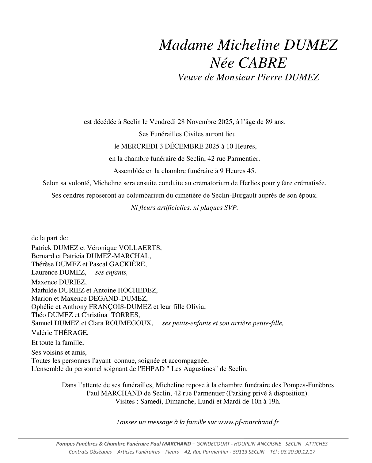 Fallecida en Seclin (59113, Francia) el jueves, 27 de noviembre de 2025 a la edad de 89 años