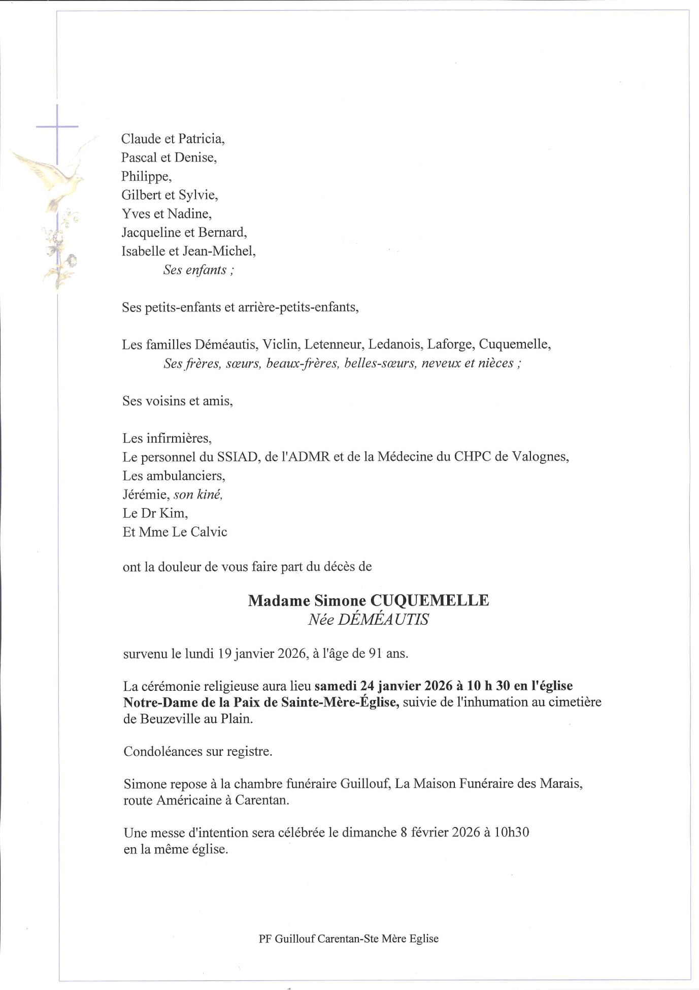 Décédée à Valognes (50700, France) le lundi 19 janvier 2026 à l'âge de 91 ans