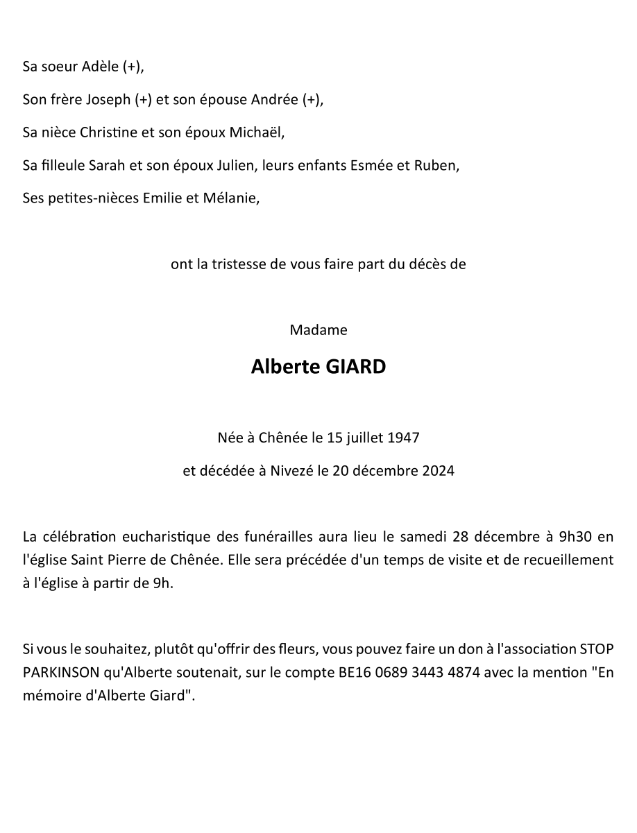 Décédée à Nivezé (4900) le vendredi 20 décembre 2024 à l'âge de 77 ans