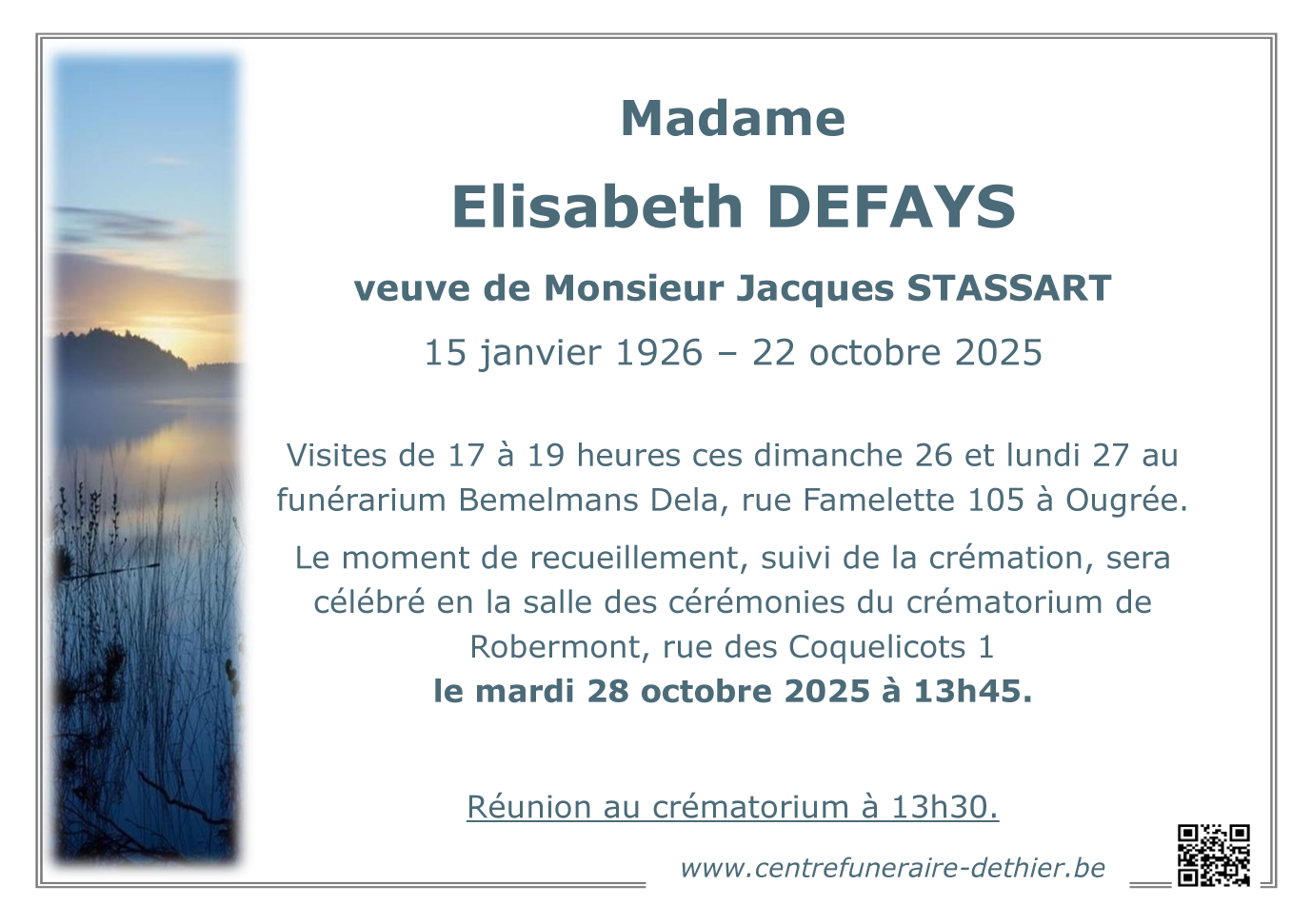 Décédée à Liège (4000) le mercredi 22 octobre 2025 à l'âge de 99 ans