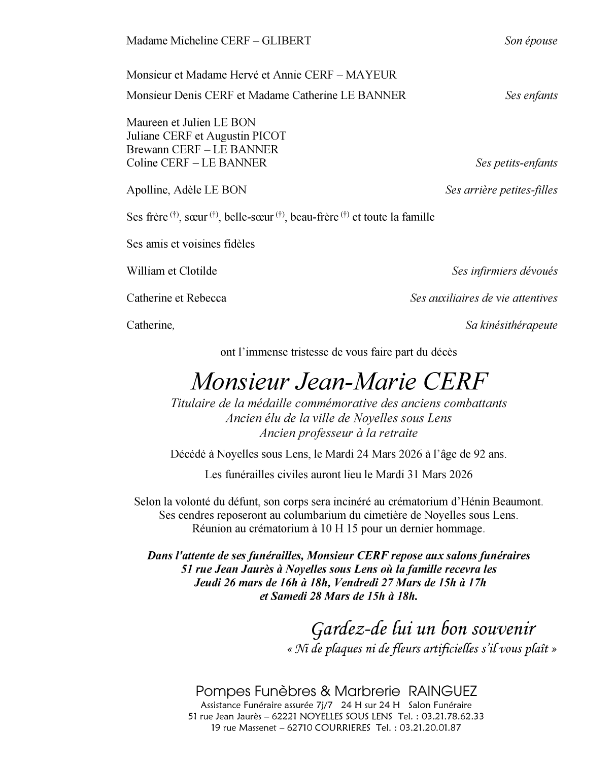 Died in Noyelles-sous-Lens (62221, France) on 24 March 2026 at the age of 92 years