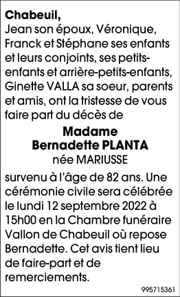 Fallecida en Chabeuil (26120, Francia) el jueves, 8 de septiembre de 2022 a la edad de 82 años