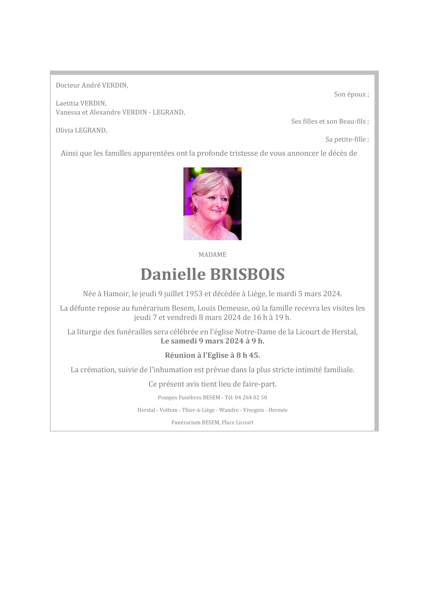 Died in Liège (4000) on 05 March 2024 at the age of 70 years