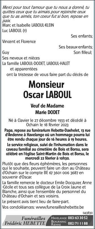 Overleden te Clavier (4560) op zaterdag 18 februari 2023 op 89-jarige leeftijd