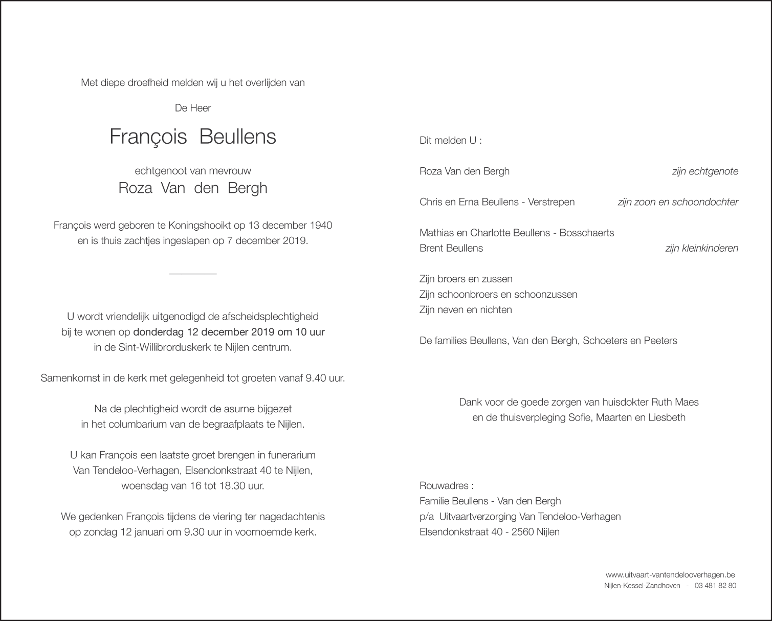 Décédé à Nijlen (2560) le samedi 7 décembre 2019 à l'âge de 78 ans