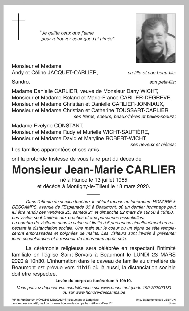 Fallecido en Montigny-le-Tilleul (6110) el miércoles, 18 de marzo de 2020 a la edad de 64 años