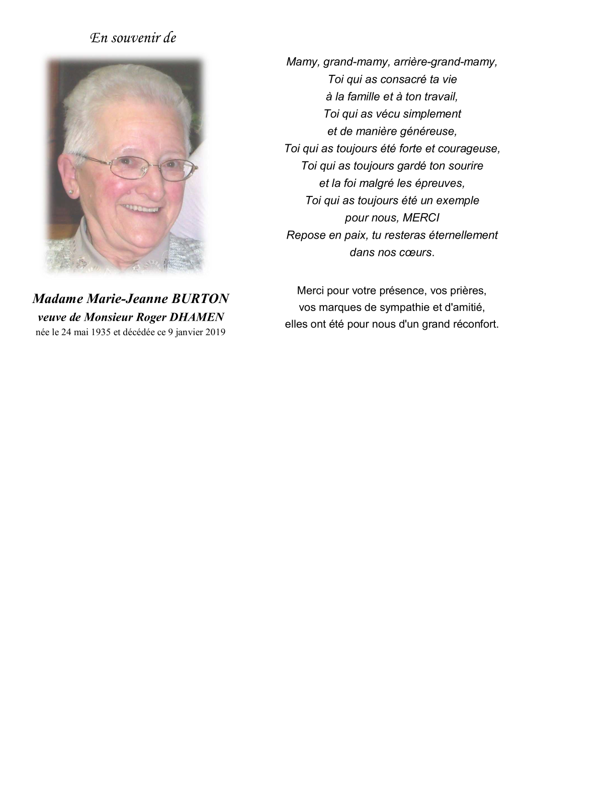 Widow of Monsieur Roger DHAMEN