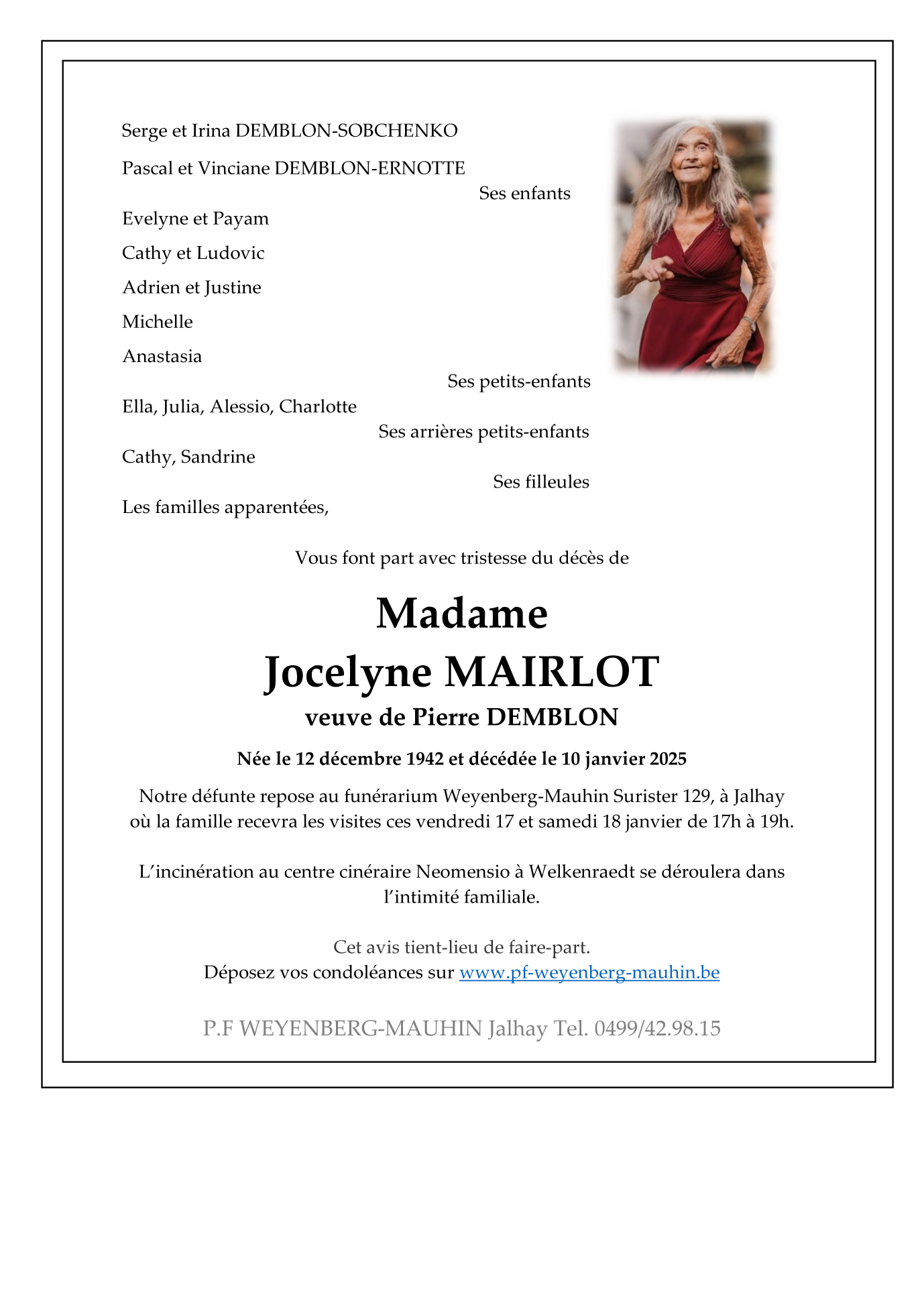 Décédée à Verviers (4800) le vendredi 10 janvier 2025 à l'âge de 82 ans