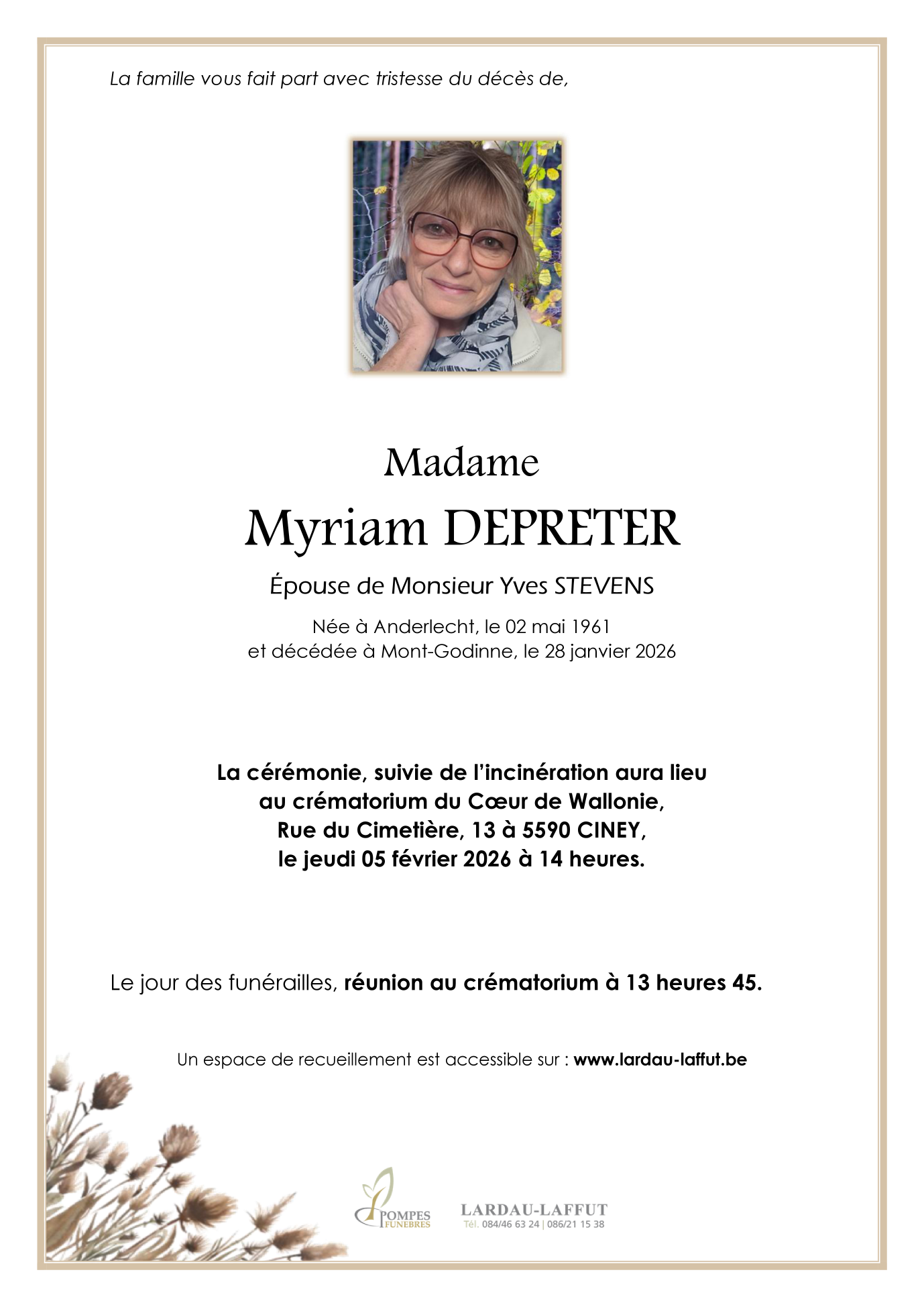 Décédée à Mont-Godinne (5530) le mercredi 28 janvier 2026 à l'âge de 64 ans