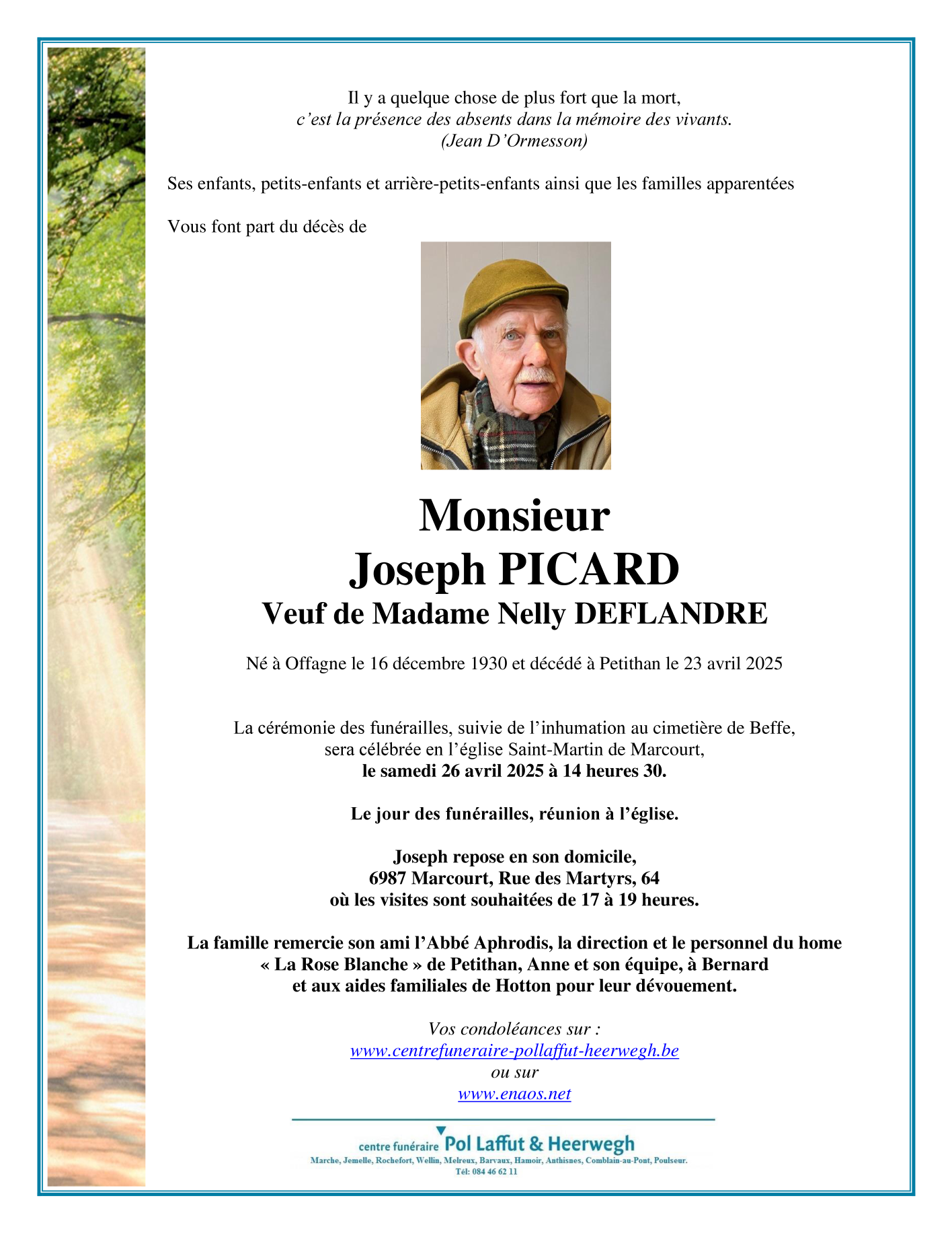 Décédé à Petit-Han (6940) le mercredi 23 avril 2025 à l'âge de 94 ans