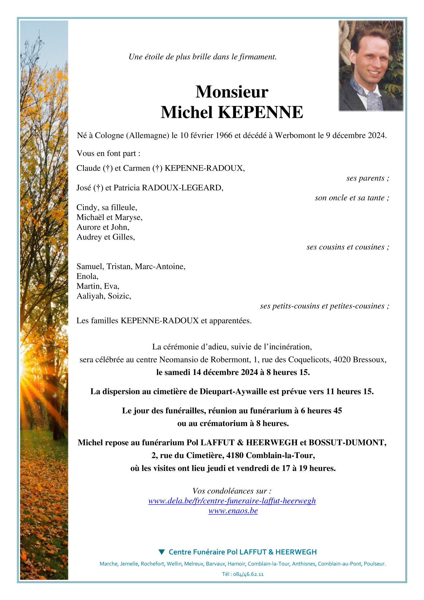 Died in Werbomont (4190) on 09 December 2024 at the age of 58 years