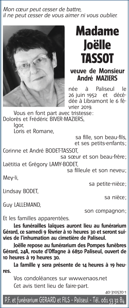 Fallecida en Libramont (6800) el miércoles, 6 de febrero de 2019 a la edad de 66 años