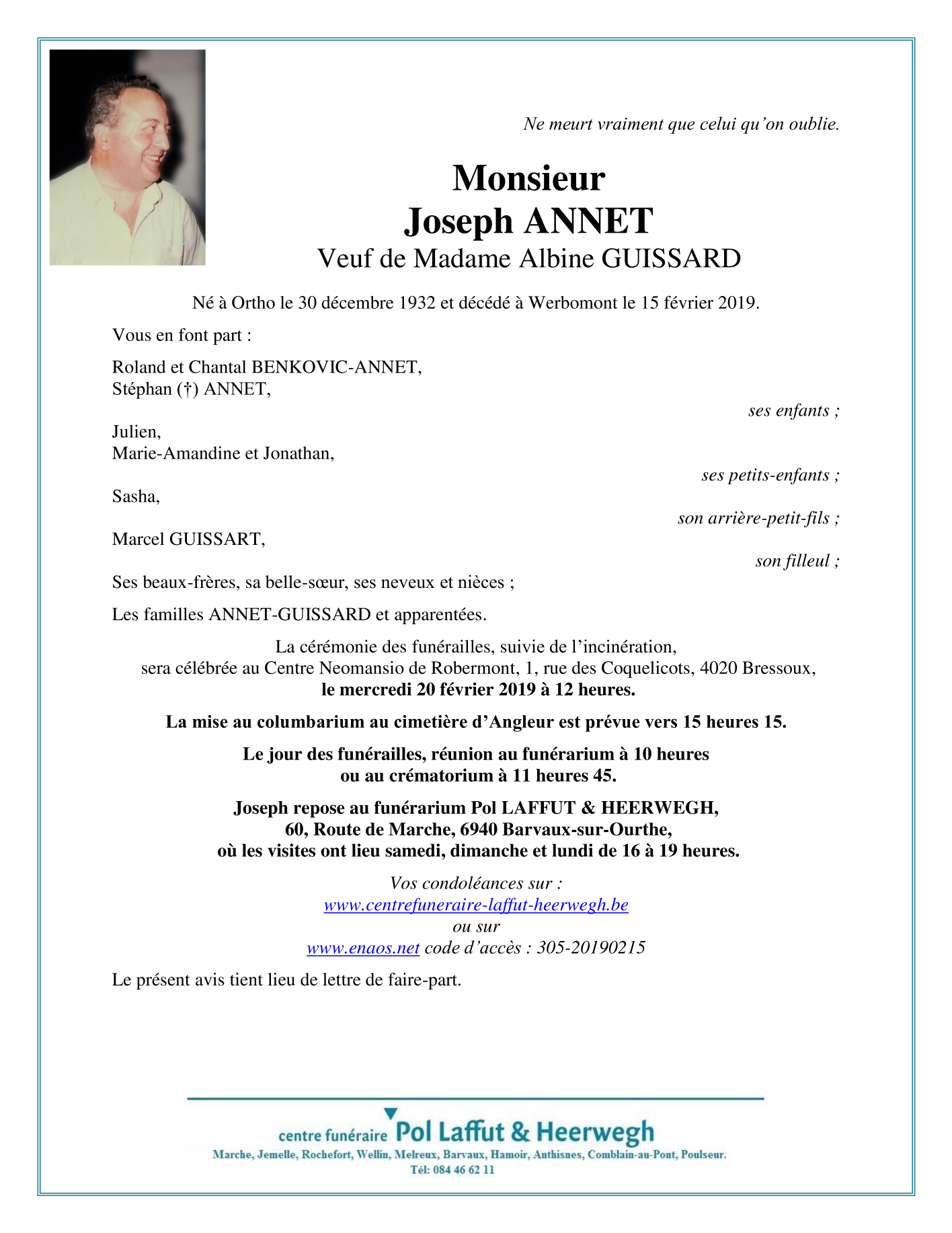 Fallecido en Werbomont (4190) el viernes, 15 de febrero de 2019 a la edad de 86 años