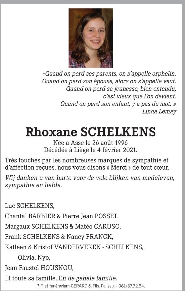 Fallecida en Liège (4000) el jueves, 4 de febrero de 2021 a la edad de 24 años