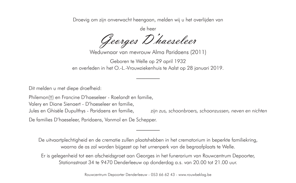 Overleden te Aalst (9300) op maandag 28 januari 2019 op 86-jarige leeftijd