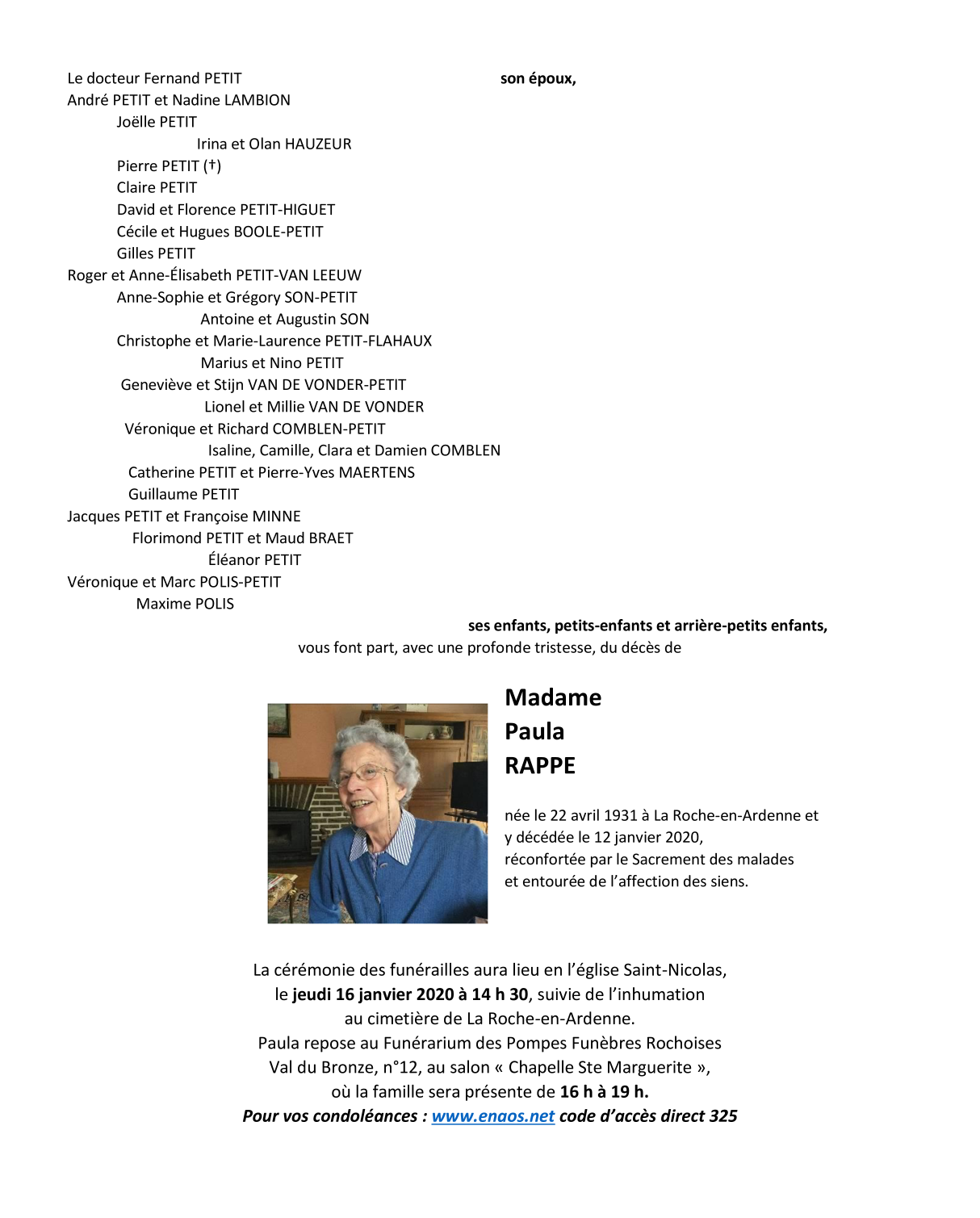 Décédée à La Roche-en-Ardenne (6980) le dimanche 12 janvier 2020 à l'âge de 88 ans