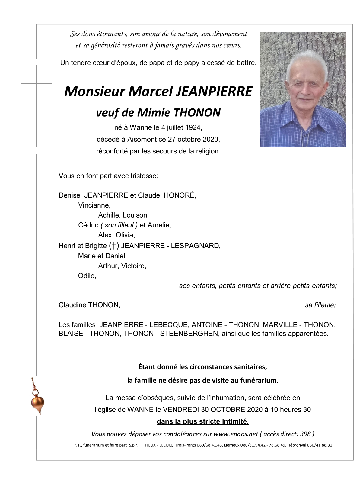 Décédé à Aisomont (4980) le mardi 27 octobre 2020 à l'âge de 96 ans