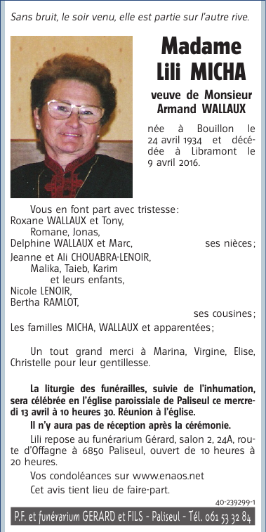 Décédée à Libramont (6800) le dimanche 10 avril 2016 à l'âge de 81 ans