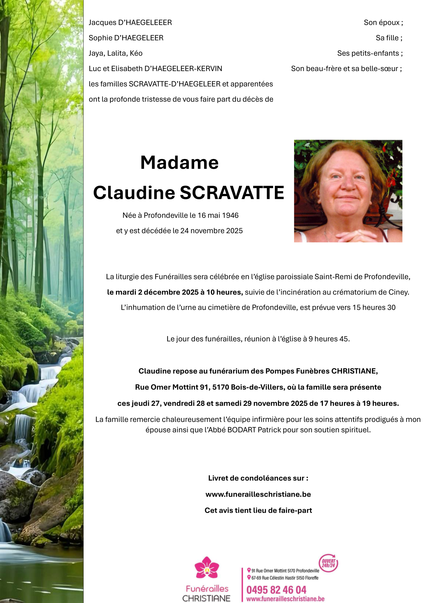Décédée à Profondeville (5170) le lundi 24 novembre 2025 à l'âge de 79 ans