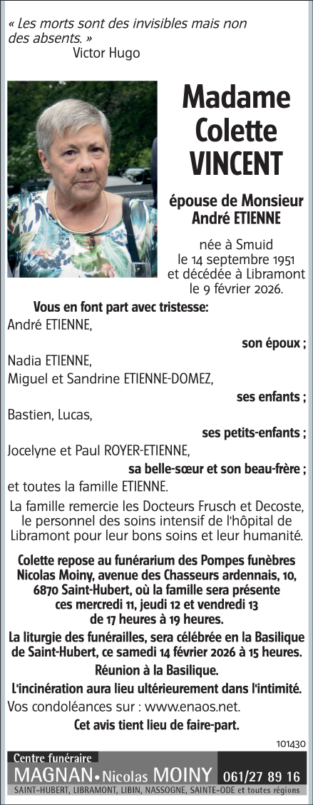 Décédée à Libramont (6800) le lundi 9 février 2026 à l'âge de 74 ans