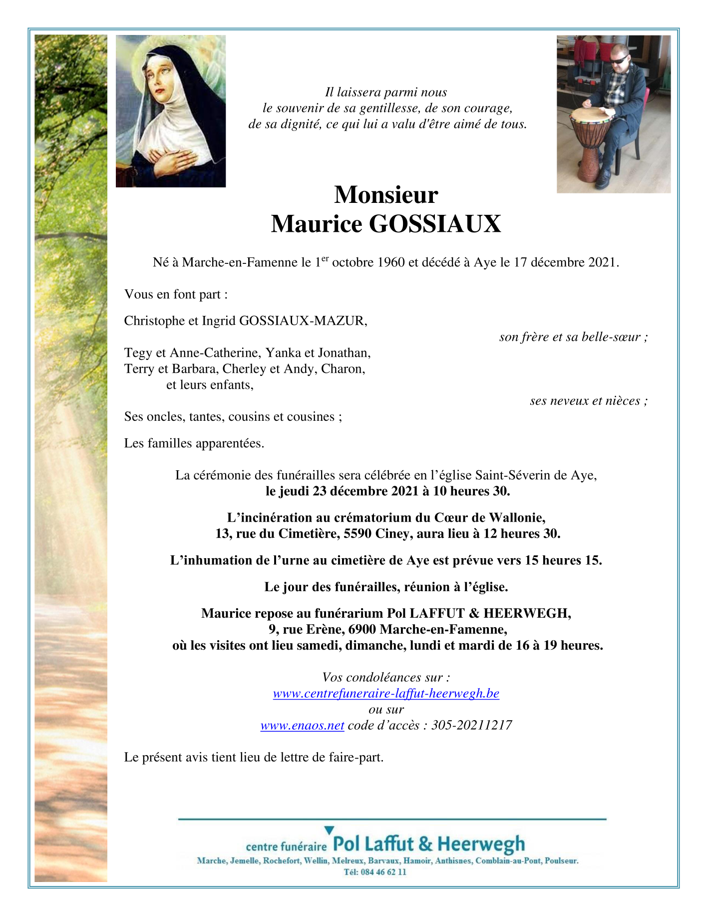 Décédé à Aye (6900) le vendredi 17 décembre 2021 à l'âge de 61 ans