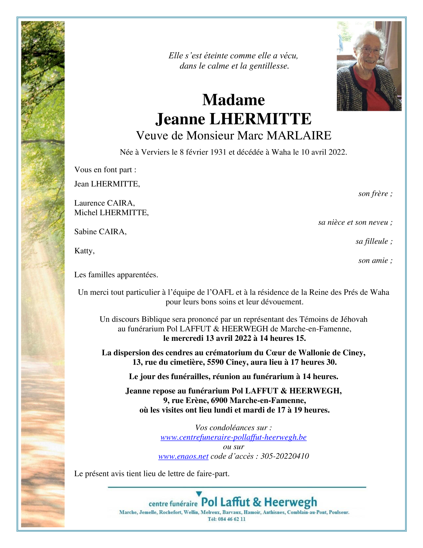 Décédée à Waha (6900) le dimanche 10 avril 2022 à l'âge de 91 ans