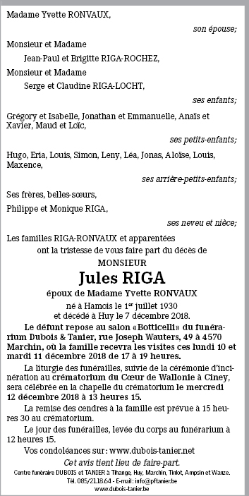 Décédé à Huy (4500) le vendredi 7 décembre 2018 à l'âge de 88 ans