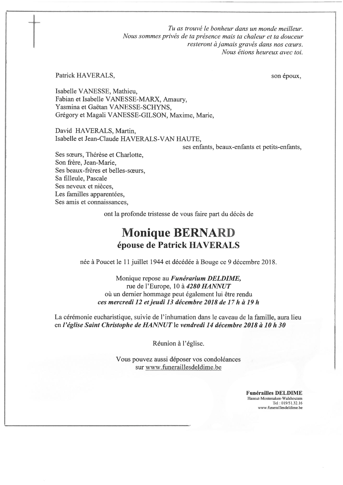 Décédée à Namur (5000) le dimanche 9 décembre 2018 à l'âge de 74 ans
