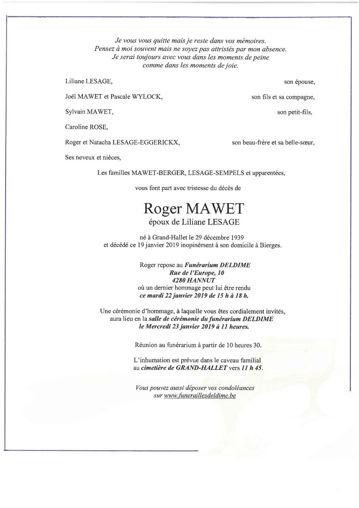 Décédé à Bierges (1301) le samedi 19 janvier 2019 à l'âge de 79 ans