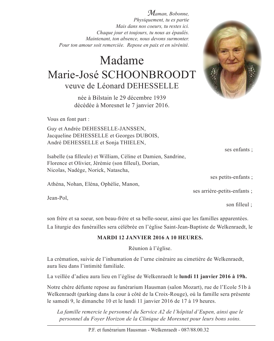 Fallecida en Moresnet (4850) el jueves, 7 de enero de 2016 a la edad de 76 años