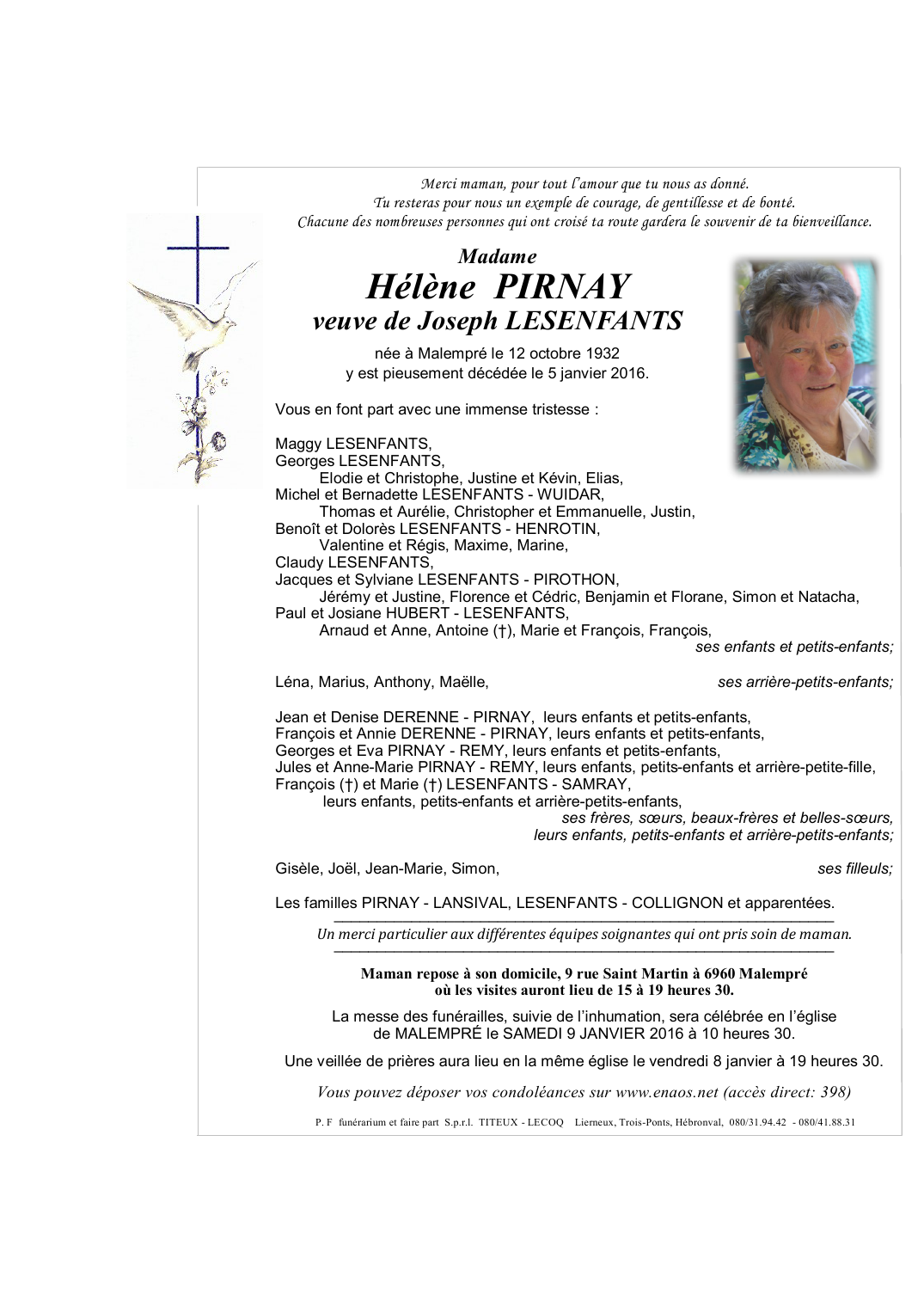 Décédée à Malempré (6960) le mardi 5 janvier 2016 à l'âge de 83 ans