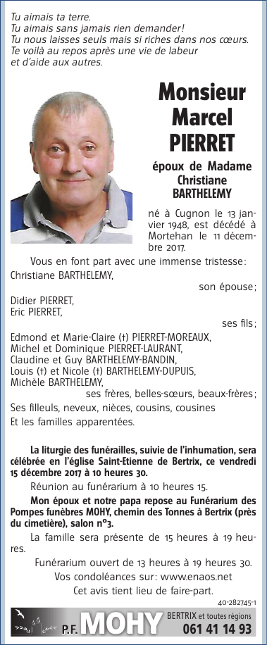 Décédé à Mortehan (6880) le lundi 11 décembre 2017 à l'âge de 69 ans