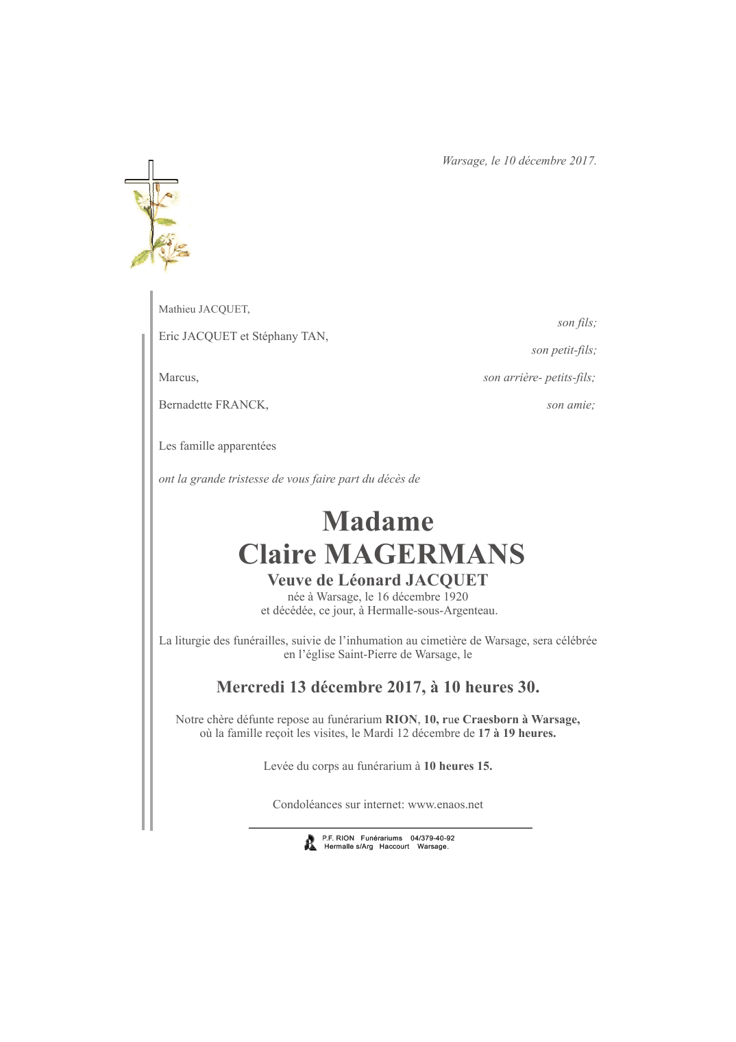 Fallecida en Hermalle-sous-Argenteau (4681) el domingo, 10 de diciembre de 2017 a la edad de 96 años