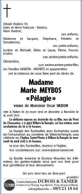 Fallecida en Nandrin (4550) el sábado, 15 de abril de 2017 a la edad de 101 años