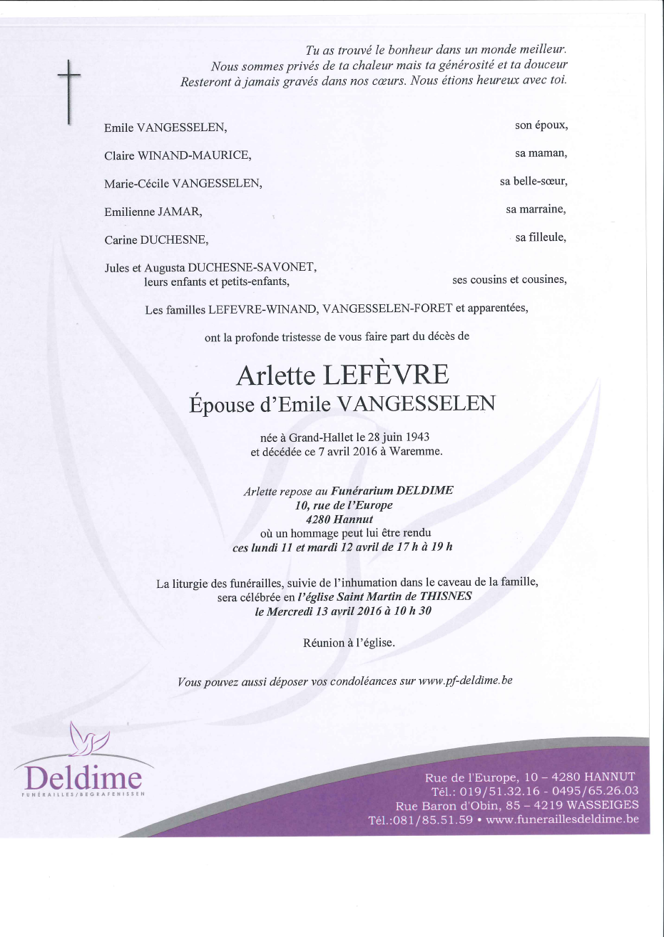 Fallecida en Thisnes (4280) el jueves, 7 de abril de 2016 a la edad de 72 años