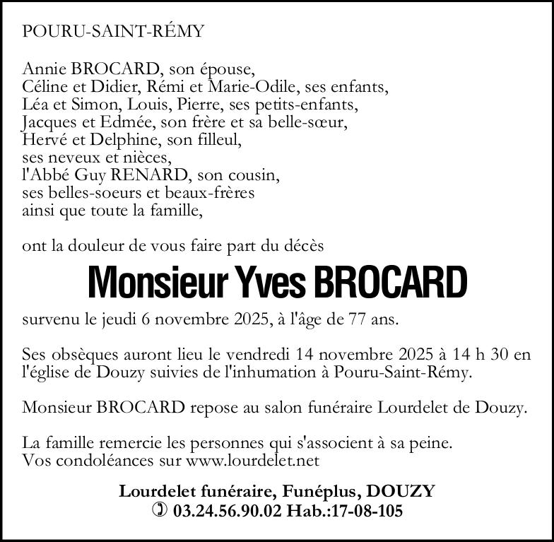 |  Woonachtig te Pouru-Saint-Remy (08140, Frankrijk) Geboren te Pouru-Saint-Remy (08140, Frankrijk) op zaterdag 10 januari 1948 Overleden te Mouzon (08210, Frankrijk) op donderdag 6 november 2025 op 77-jarige leeftijd Echtgenoot van Madame Annie BROCARD