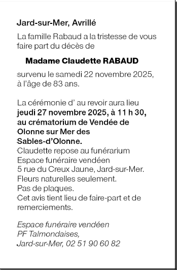 Décédée à Moutiers-les-Mauxfaits (85540, France) le samedi 22 novembre 2025 à l'âge de 83 ans