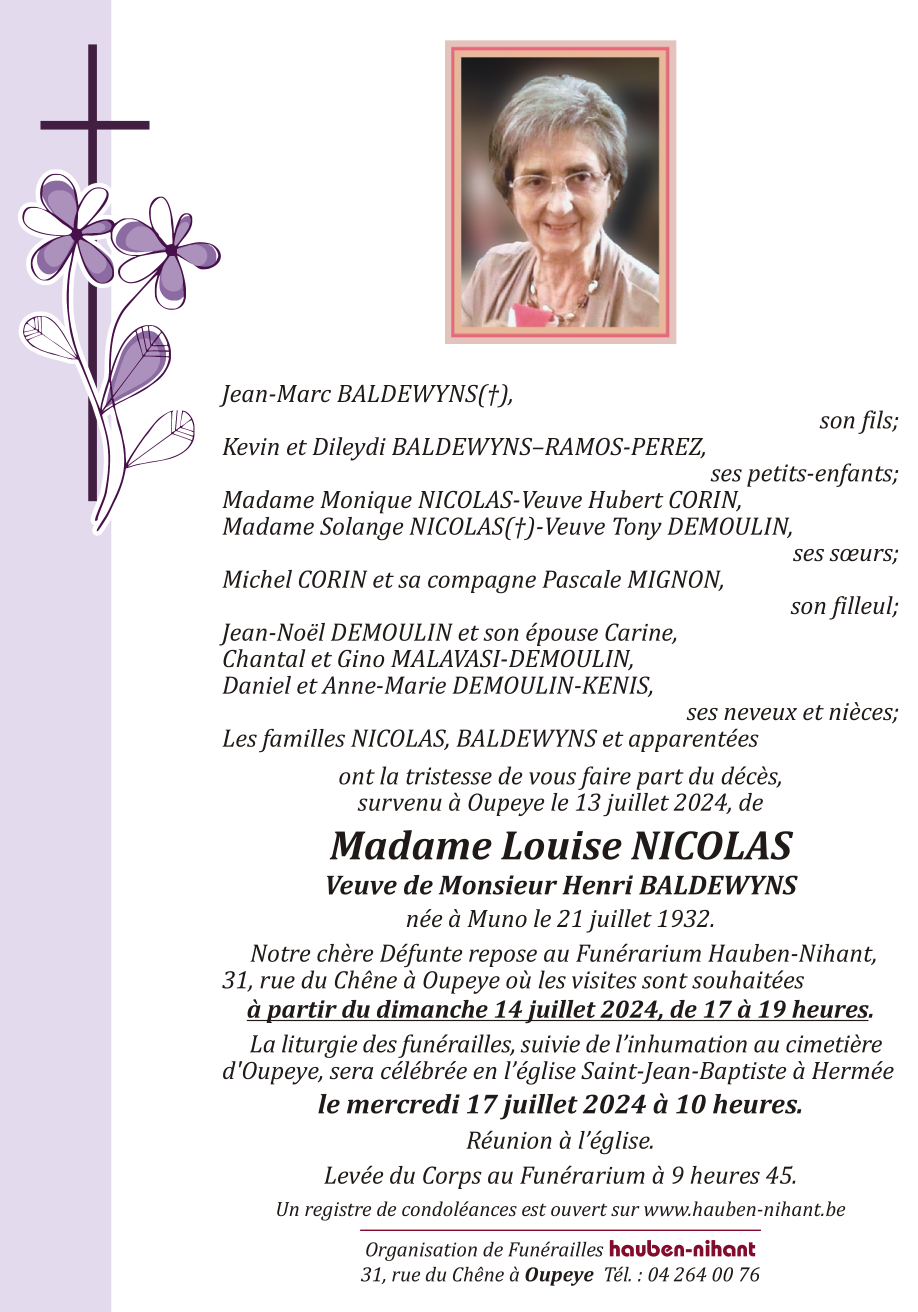 Décédée à Oupeye (4680) le samedi 13 juillet 2024 à l'âge de 91 ans
