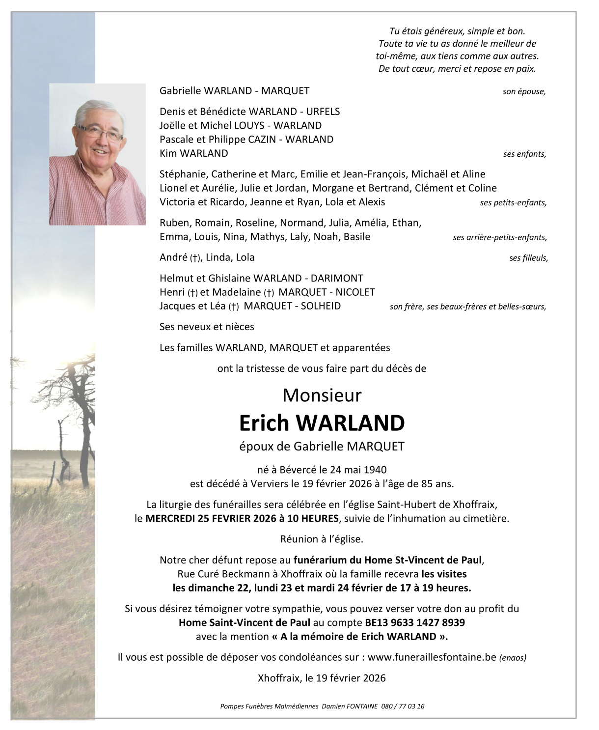 Décédé à Verviers (4800) le jeudi 19 février 2026 à l'âge de 85 ans