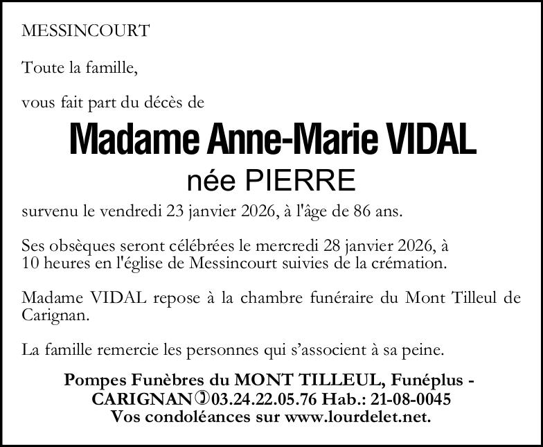 | Madame Anne-Marie VIDAL née PIERREDomiciliada en Messincourt (08110, Francia) Nacida en Pouru-Saint-Remy (08140, Francia) el domingo, 17 de diciembre de 1939 Fallecida en Sedan (08200, Francia) el viernes, 23 de enero de 2026 a la edad de 86 años Viuda de Monsieur Emile VIDAL