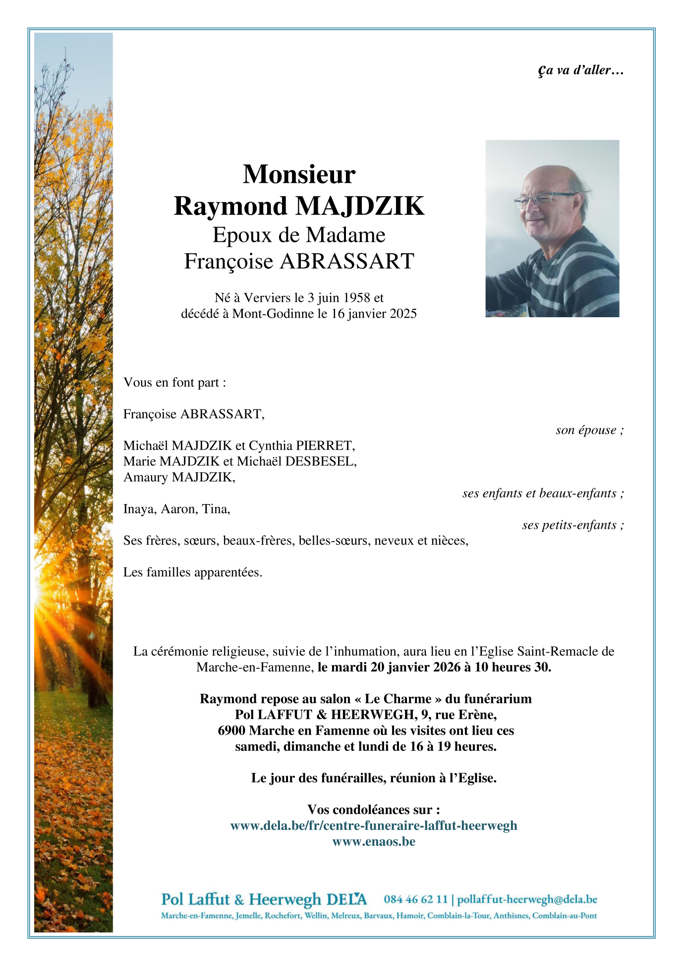 Died in Marche-en-Famenne (6900) on 16 January 2026 at the age of 67 years