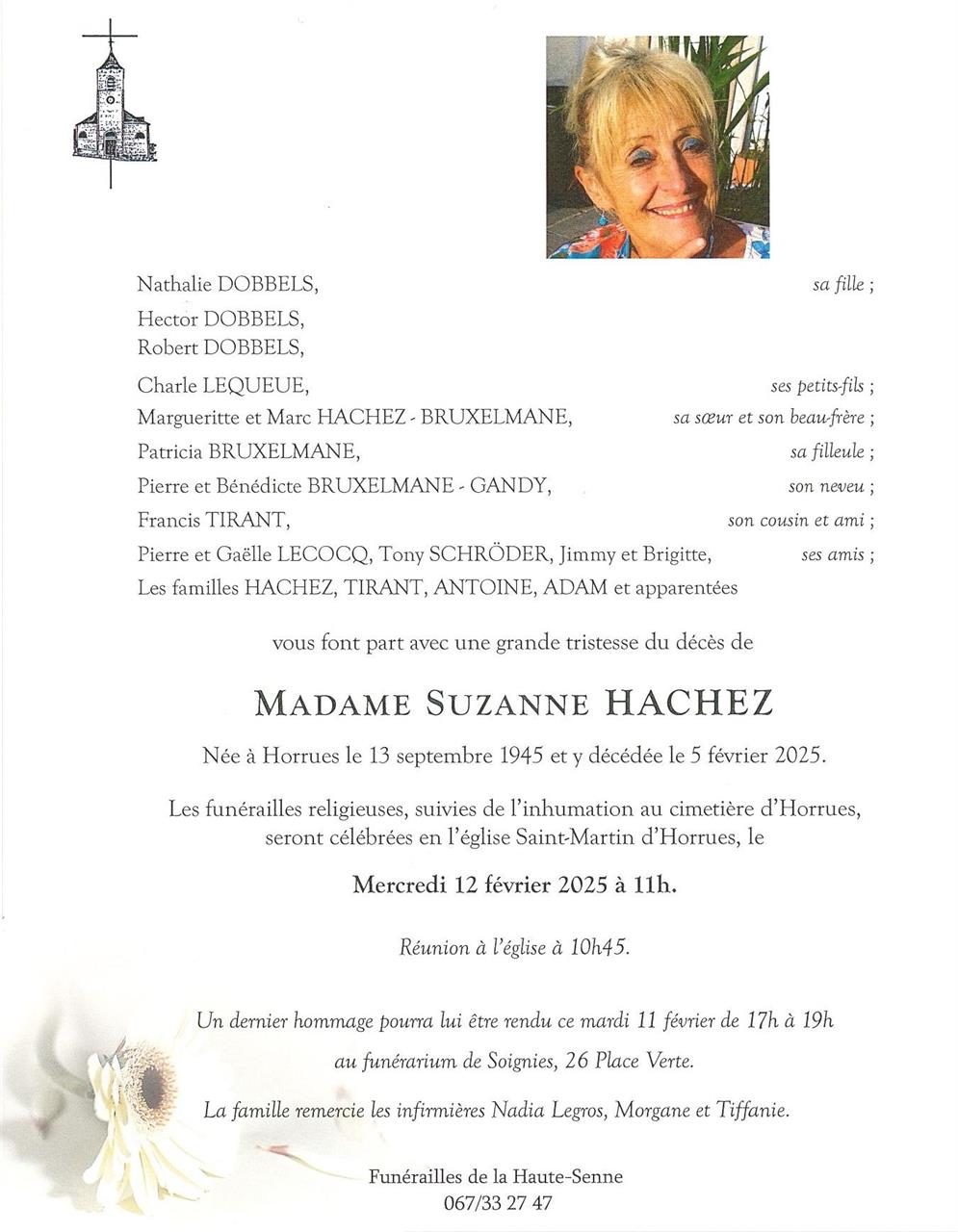 Décédée à Soignies (7060) le mercredi 5 février 2025 à l'âge de 79 ans