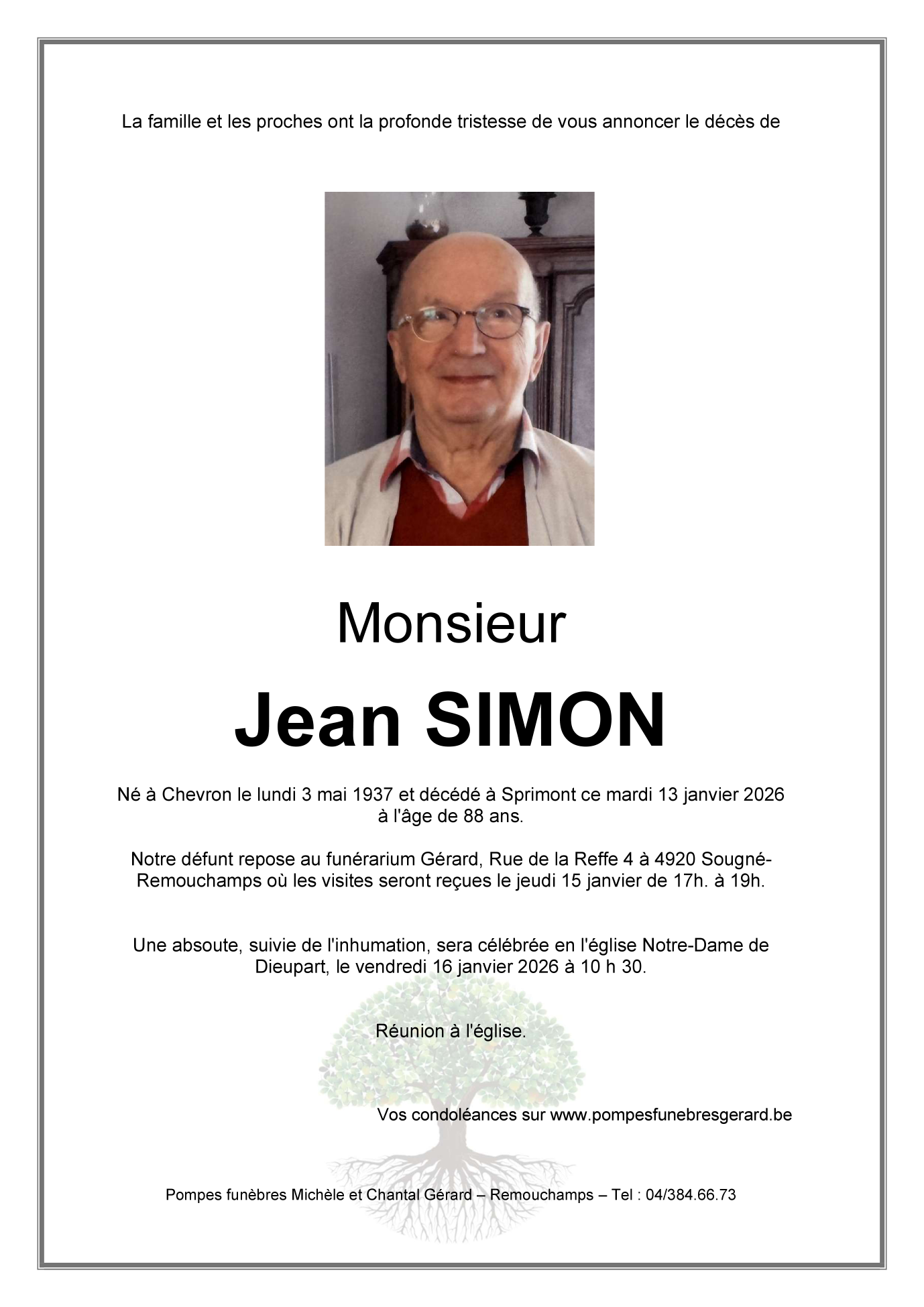 Overleden te Sprimont (4140) op dinsdag 13 januari 2026 op 88-jarige leeftijd